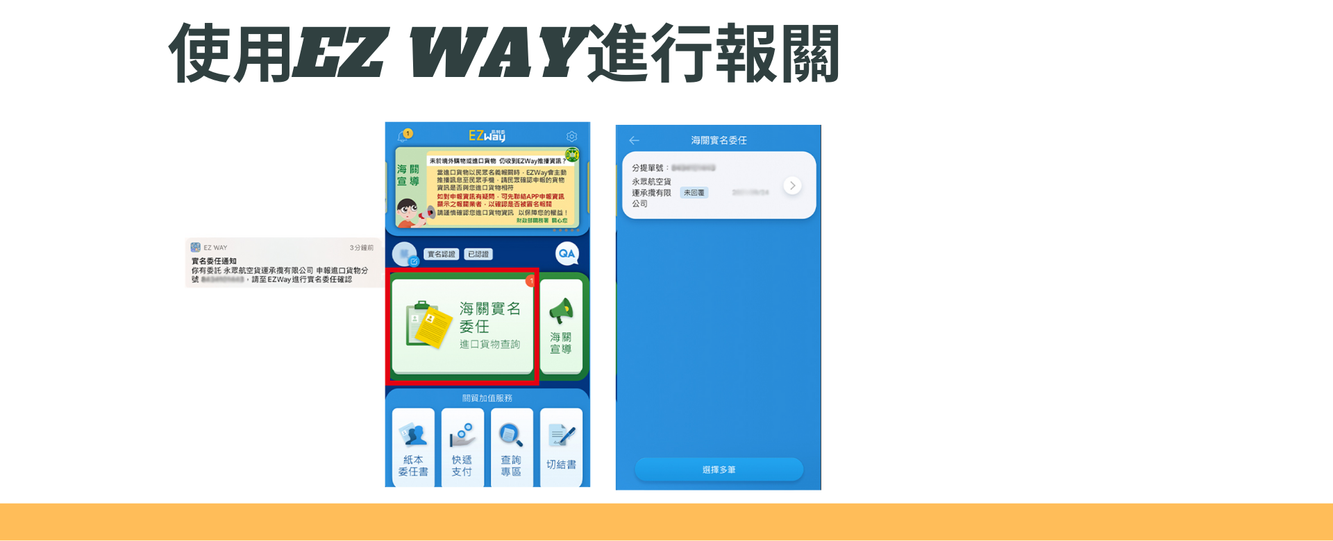 是要先把委任文件交給物流業者,再由他們交給海關。使用EZ WAY 報關,不用把個資交給業者,增加風險!